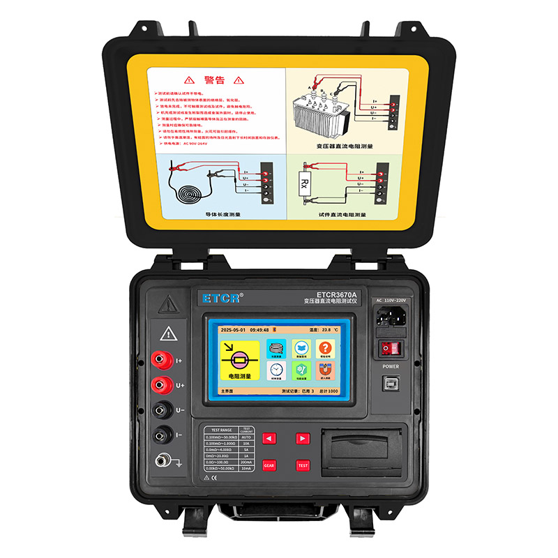ETCR3670A变压器直流电阻测试仪又称变压器绕组测试仪,直流电阻测试仪,用于快速测量各种变压器绕组直流电阻。变压器制造中半成品、成品出厂试验、安装、交接试验及电力部门预防性试验的必测项目,能有效发现变压器线圈的选材、焊接、连接部位松动、缺股、断线等制造缺陷和运行后存在的隐患。