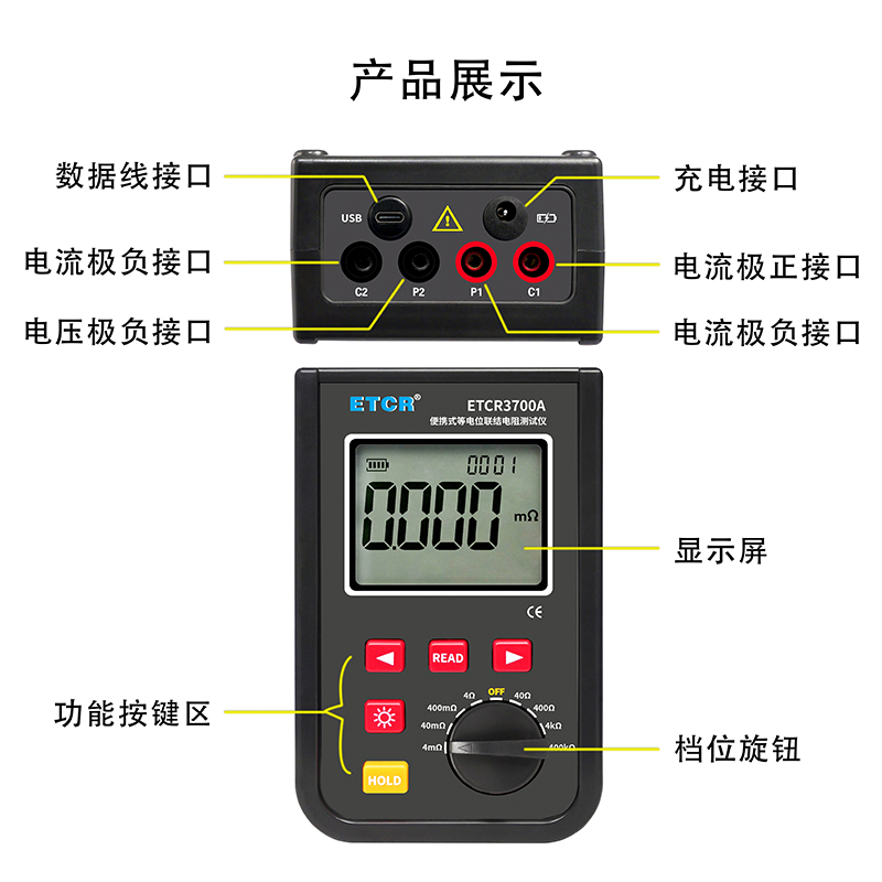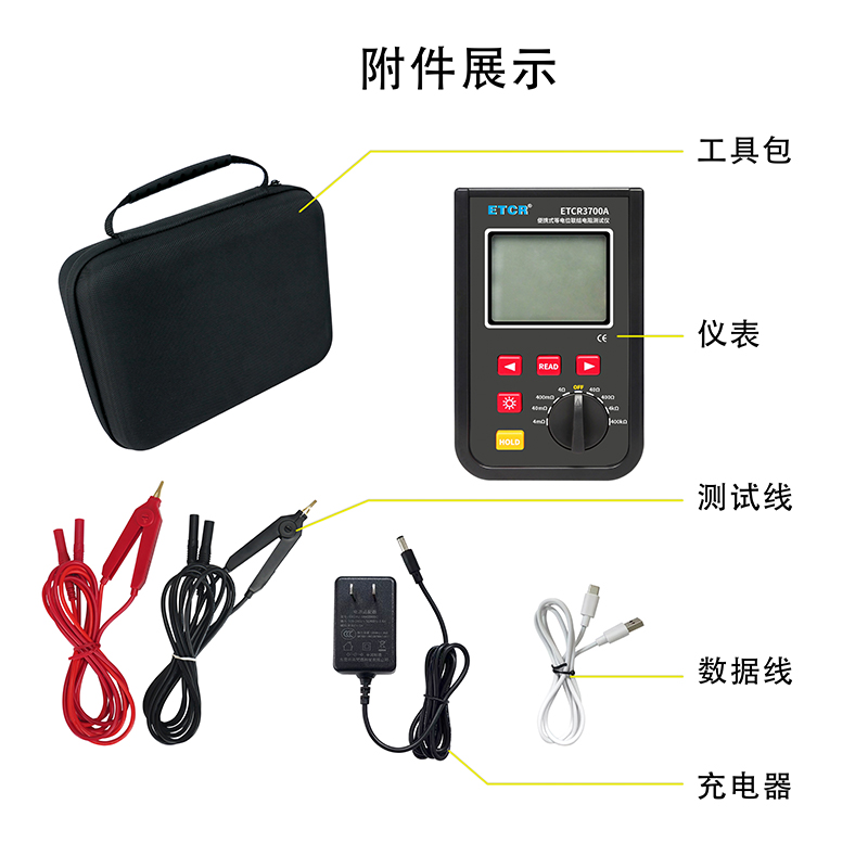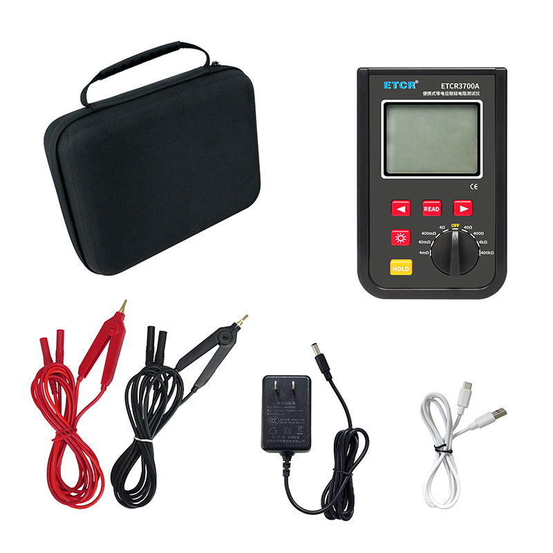 | ETCR3700A便携式等电位联结电阻测试仪 | 0.001mΩ~40.0kΩ | 4mΩ、40mΩ、400mΩ、4Ω、40Ω、400Ω、4kΩ、400kΩ | 1.2A MAX | —— | 9999组 | 蓝牙、USB |