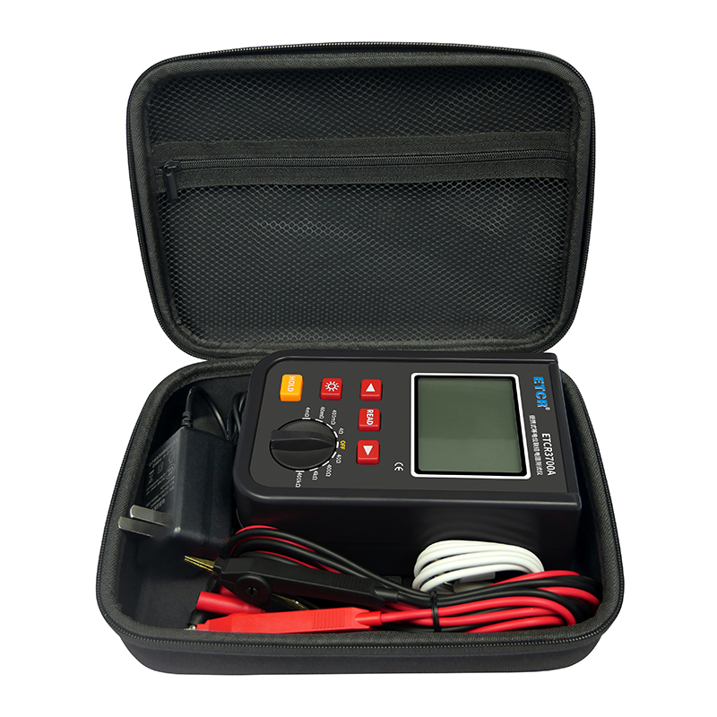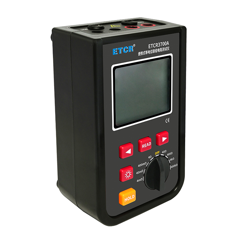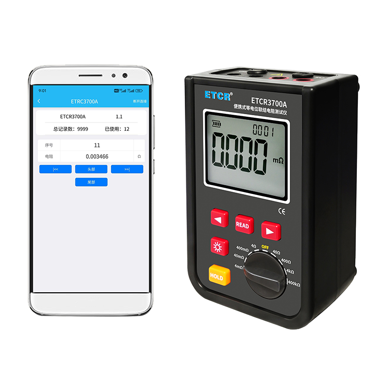 ETCR3700A等电位联接电阻测试仪由主机、测试线组成。宽量程:0.001mΩ~400kΩ,高分辨率1uΩ,最大测试电流:1.2A,主机大屏LCD显示,采用可充电大容量锂电池,仪表具有自动关机功能,数据存储功能,存储测试数据9999组,具有蓝牙通讯,安装APP后可在手机查看测试记录,具有USB接口,安装上位机软件后,可将测试数据下载电脑进行保存、管理、查询、分析、打印等,仪表操作简易,携带方便。