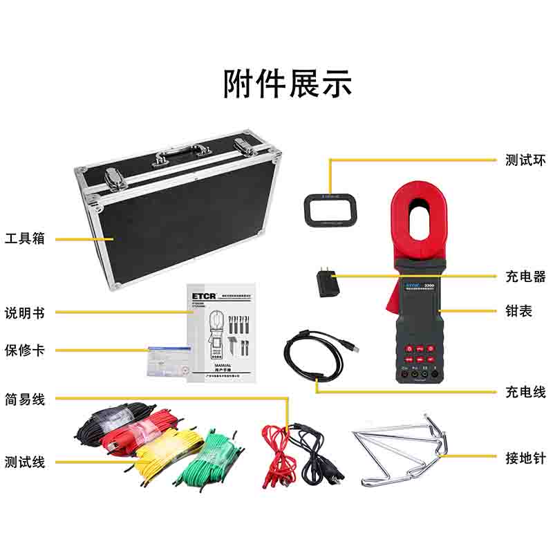ETCR2300地桩式钳形接地电阻表又称地桩式钳形接地电阻表、地桩式钳形表,用于现场测量接地电阻、土壤电阻率、接地电流、接地电压。仪表具有钳表法、二线法、三线法、四线法、选择法等各种测量方法,仪表导入FFT(快速傅立叶变换)技术、AFC(自动频率控制)技术,具有独特的抗干扰能力和环境适应能力,重复测试一致性强,确保测量的高精度、高稳定性和高可靠性。