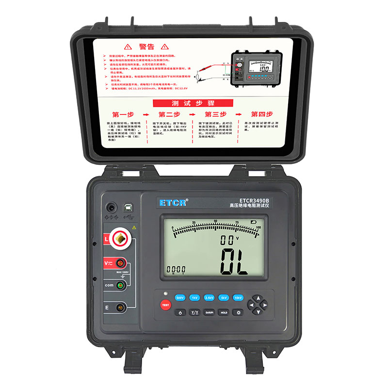 ETCR3490系列高压绝缘电阻测试仪又名兆欧表、绝缘电阻测试仪等,用于绝缘电阻的测试。本仪表是一款高性能数字式仪表,具有LCD大屏幕带背光显示、数据保持、自动放电、自动关机等功能。仪表具有测试计时,电压监测功能,回路电压大于36V时,仪表将禁止测试以保护被测物及人员安全。仪表功能操作简易,绝缘电阻值,测试时间,输出电压同屏显示,同时还具备吸收比、极化指数测试、交流电压、直流电压测试功能。