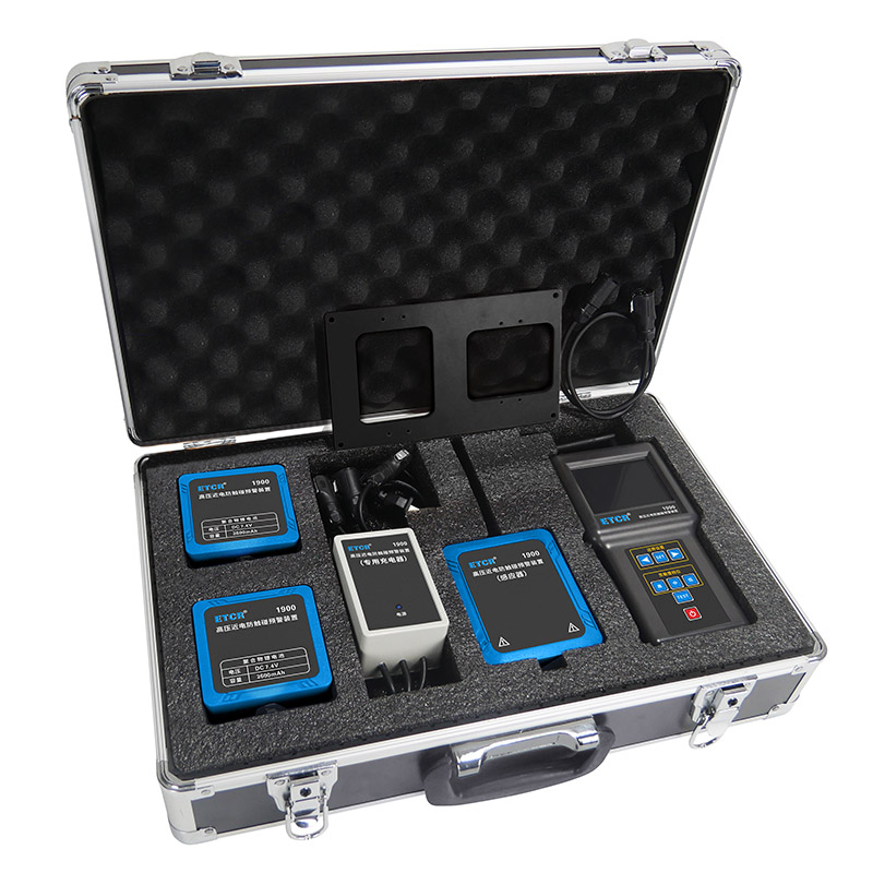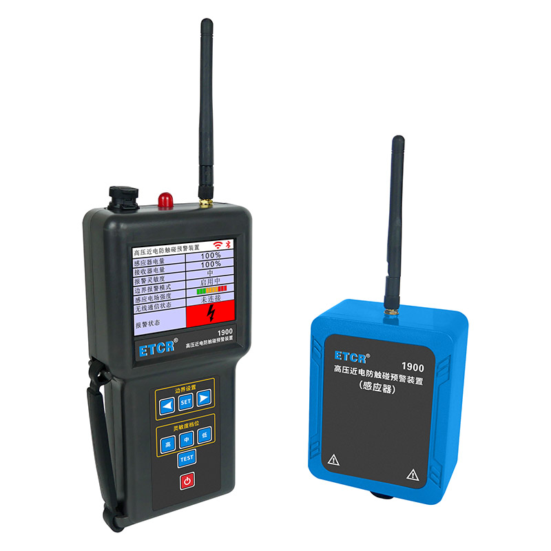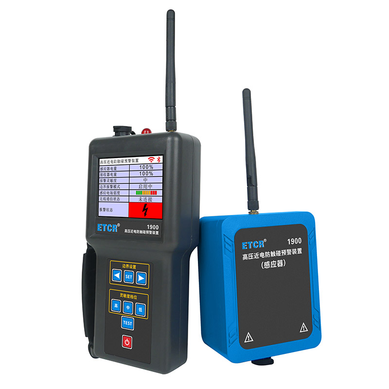 ETCR1900高压近电防触碰智能预警装置由感应器、外置电池、接收器、蓝牙APP组成。感应器采用非接触感应技术用于监测高压电场,接收器接受感应器发送的监测信号,当电场强度达到设定的报警值时,触发报警功能发出声光报警及语音报警。感应器与接收器采用无线通讯,传输距离200米。装置具有报警灵敏度调节和边界报警功能,用户可在接收器设置报警灵敏度或自设定报警距离,以适应复杂电场的环境。接收器具有485接口及蓝牙功能,便于用户二次开发。移动终端安装APP后,可查看报警信号或设置报警参数。