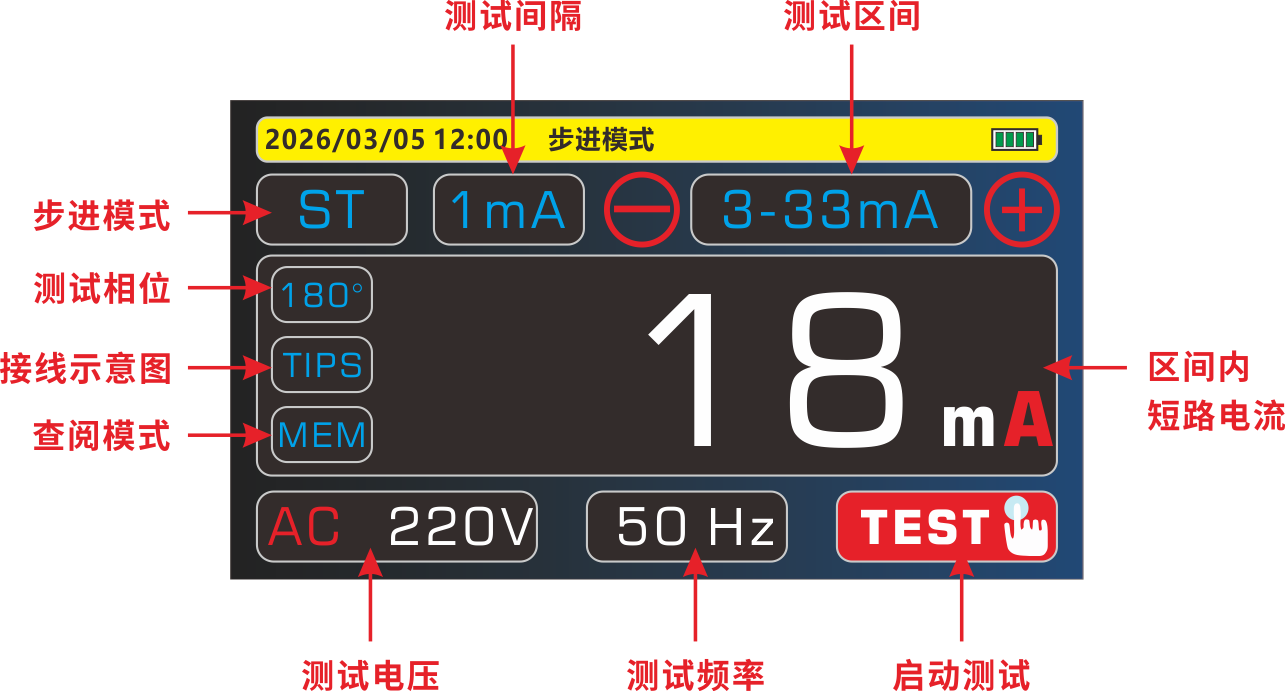 3、 采用步进模式测试漏电动作电流值,量程为3mA~110mA。