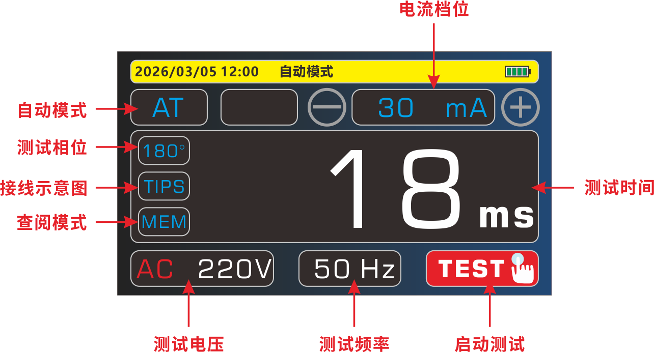 功 能 | 测试各种漏电保护器的漏电动作时间、漏电动作电流、线路交流电压 |