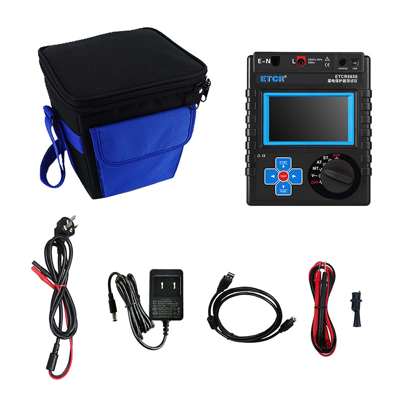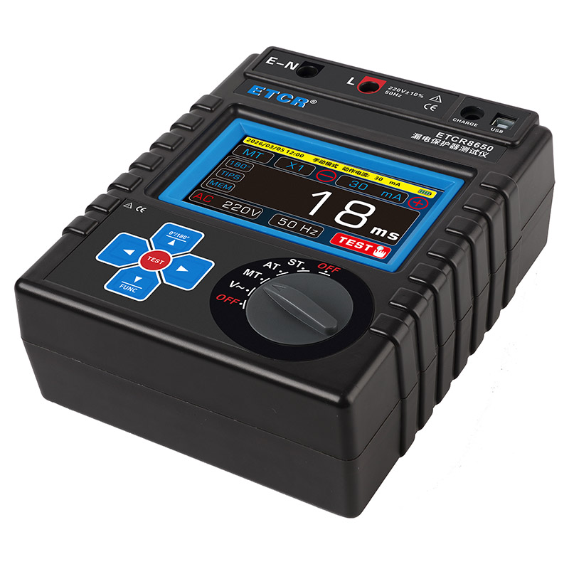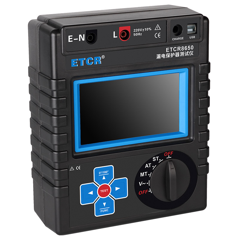 ETCR8650漏电保护器测试仪采用5寸全彩触摸屏,具有电池电量显示、5分钟自动关机、设定故障电压指示、背光亮度调节、时钟显示、数据存储等功能,显示屏内设接线指导图,提示操作方法,仪表还具有蓝牙通信与USB通信功能,是各种漏电保护器现场或室内检测的理想工具。