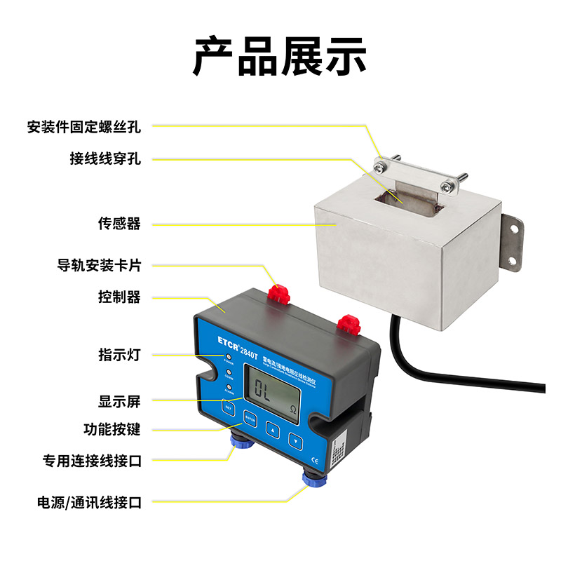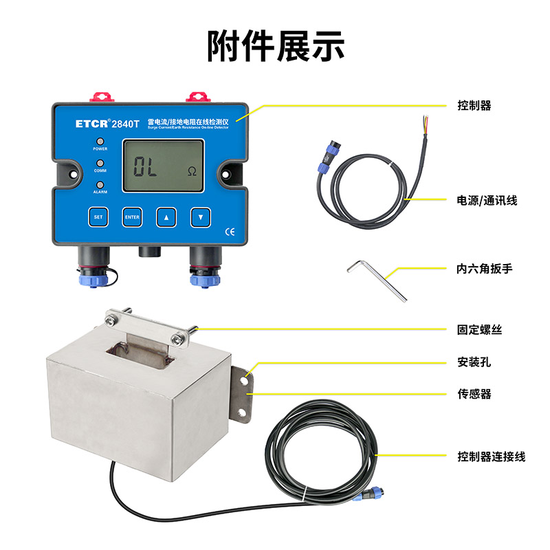 ETCR2840T雷击电流/接地电阻在线监测仪由控制器、传感器、安装五金件组成。ETCR2700T为分体式结构,传感器与控制器分为两部分,传感器壳体采用不锈钢制作,坚固耐用以适应不同的应用环境。