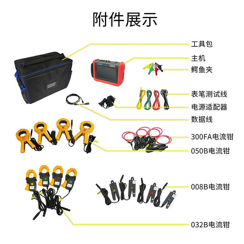 电流 | 008B电流钳:Φ8mm;(选配) 032B电流钳:32mm×40mm;(选配) 050B电流钳:AC 1A~1000A;(选配) 300FA电流钳:AC 10A~6000A;(选配) |