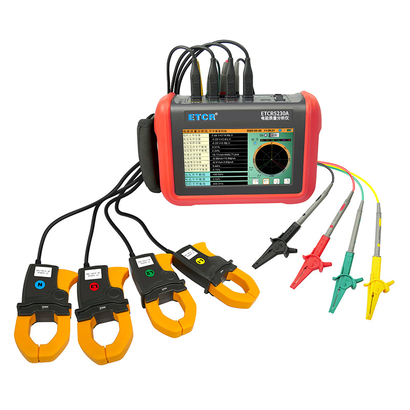 ETCR5230A电能质量分析仪是我公司精心研制的一款专为现场测试三相电能质量的高精度综合型测试仪器。仪表具有智能化、功能完善、人机操作简洁、中英文双语操作界面等特点。仪表采用7寸触摸彩屏、体积小重量轻、携带方便,可选配多款电流钳。仪表可同时测量4路电流(ABC三相及中性线电流),3路电压、三相不平衡度、有功功率、无功功率、视在功率、谐波比、总谐波失真度等;显示电流电压的实时波形、相量图;动态捕捉电压电流瞬时变化,监测启动电流,监测各电力参数并生成告警列表,长时间记录测试数据并生成趋势曲线图等功能。