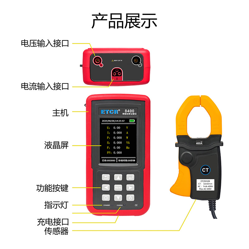 ETCR8400单相功率记录仪用于在一段时间内监测与记录单相电力的工作电压、电流、频率、功率设备。记录可输入2通道(1路电压和1路电流),可以通过USB通信线与电脑连接,把记录结果下载到电脑,以便数据保存和分析。记录仪由主机、电流钳、电源适配器、通信线、数据上传软件等组成,可广泛应用在380/220V电力系统中的故障排查,线路检修,为用电检查人员提供安全、准确、便捷的电力仪器。