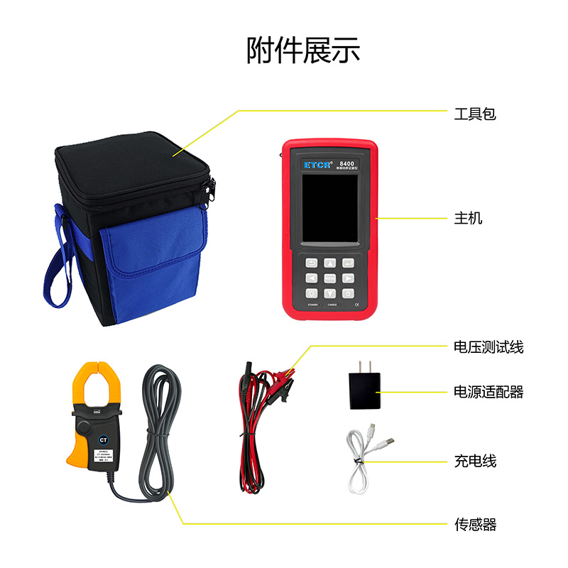 随机附件 | 主机1件;互感器1个(ETCR8400)/3个(ETCR8430);电压输入线2条(ETCR8400)/4条(ETCR8430);数据线1个;电源适配器1个;工具包1件 |