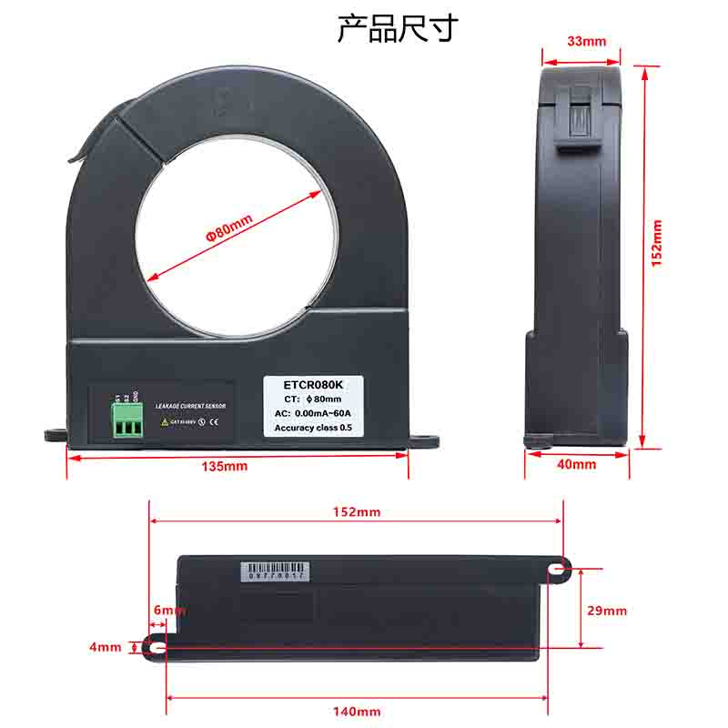 ETCR040K | ![]() | 量程:0.001mA~60A 精度等级:0.5 相位误差:≤2° 变比:800:1 工作频率:10Hz~100kHz | 0~600mA≤300Ω 0~6A≤30Ω 0~60A≤3Ω | Ф40mm | 95mm×98mm×31mm | 160g |