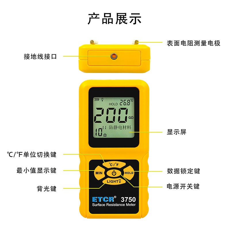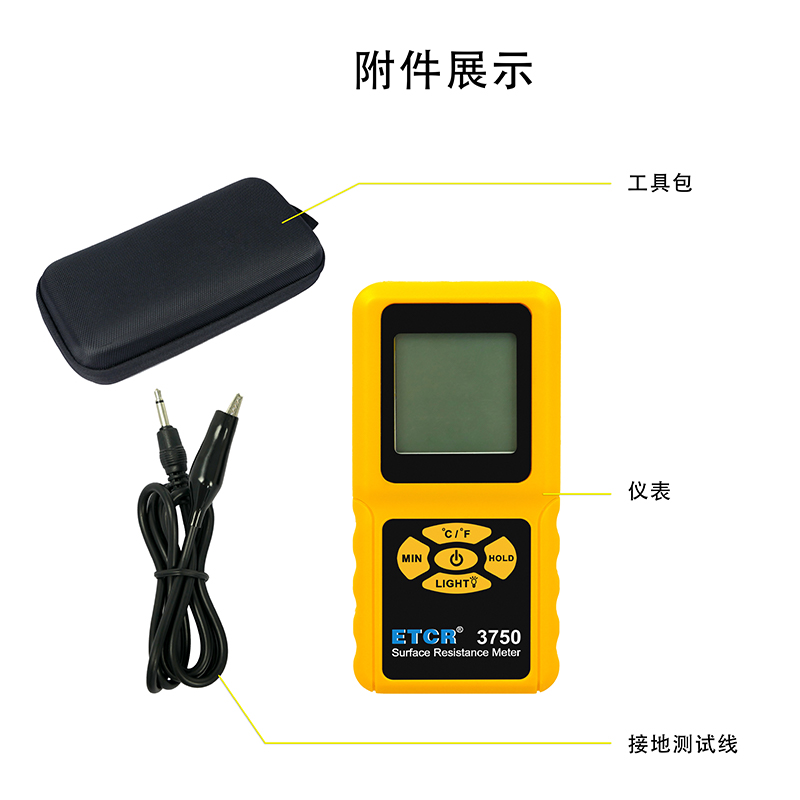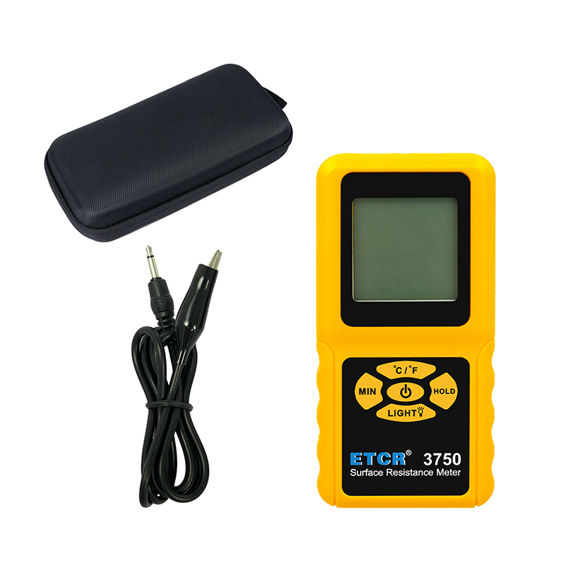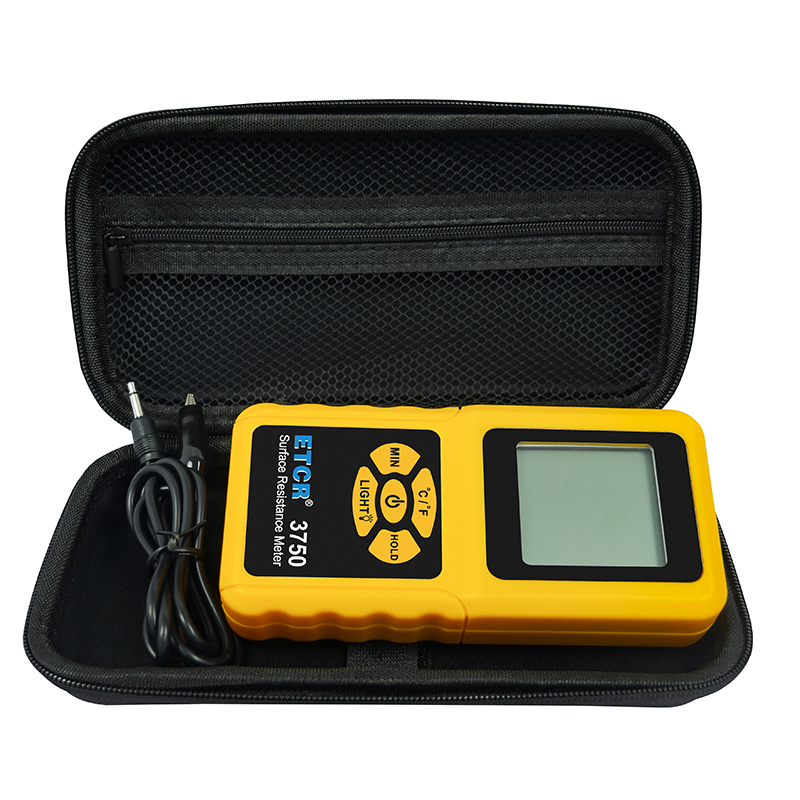 ETCR3750表面电阻测试仪是一款具有高量程的表面电阻测试仪,电阻测量范围为:103Ω~1012Ω。本产品使用方便,即可以用来测试物体表面的电阻值之外还可以测量物体的对地电阻阻值,同时还能显示当前所处环境温度。测量物体表面电阻时需将背面的两根平行金属条紧贴物体表面,待数据稳定后,即可直接从LCD显示屏上观测阻值大小,判断物体是属于导体材料、防静电材料或者是绝缘体材料,仪器适合于各种防静电领域。