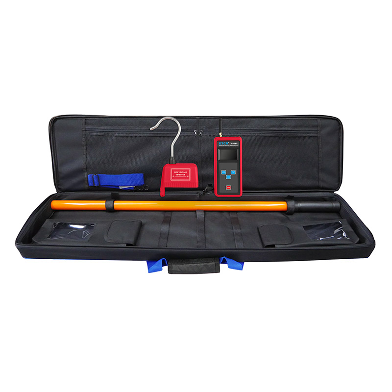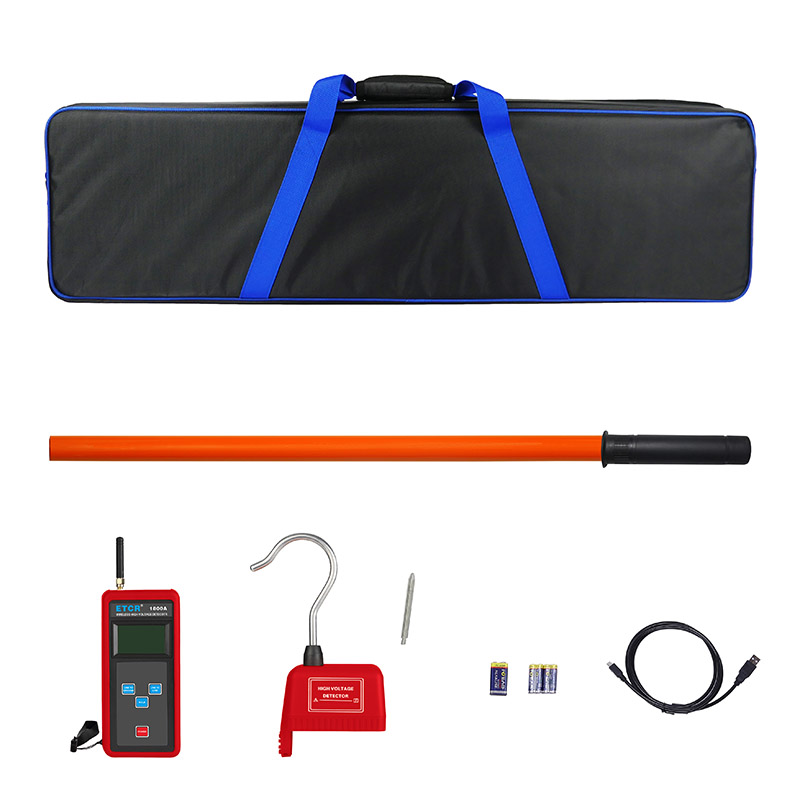 ETCR1800A无线高压验电器由接收器、探测器、伸缩绝缘杆、数据上传软件、USB通讯线等组成,测试时只需用绝缘杆把探测器挂在裸导线上,通过无线信号传输即可在手持接收器上读取电压值,一目了然非常直观,操作非常方便。无线信号直线传输距离约30米,探测器有红色LED和蜂鸣器等声光报警,使测试更简单轻松。通过USB通讯接口和上位机软件存储数据上传电脑具有历史数据查询、保存、打印等功能。
